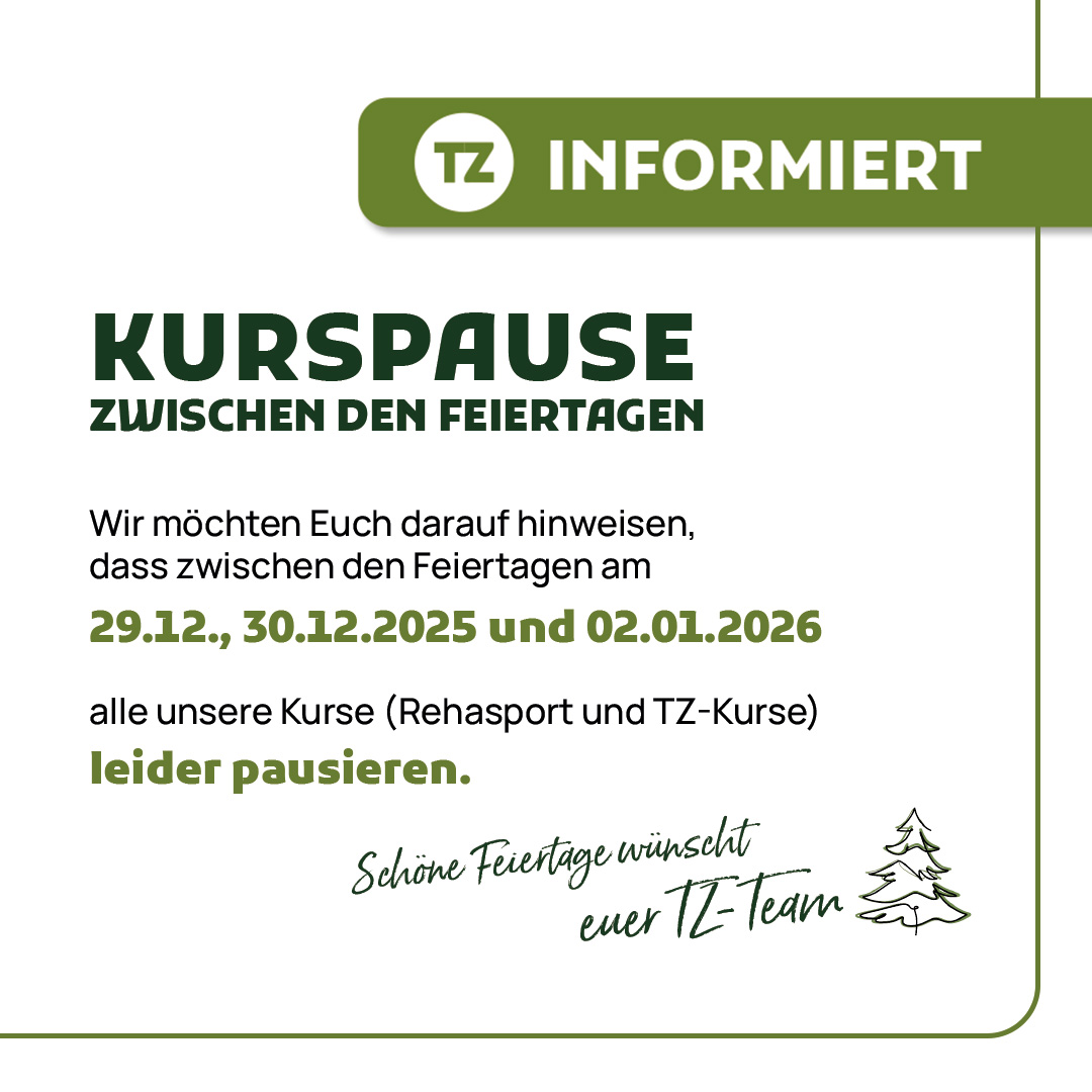 Wir machen eine kleine Weihnachtspause – zwischen Weihnachten und Neujahr pausieren die TZ und Rehasport Kurse.